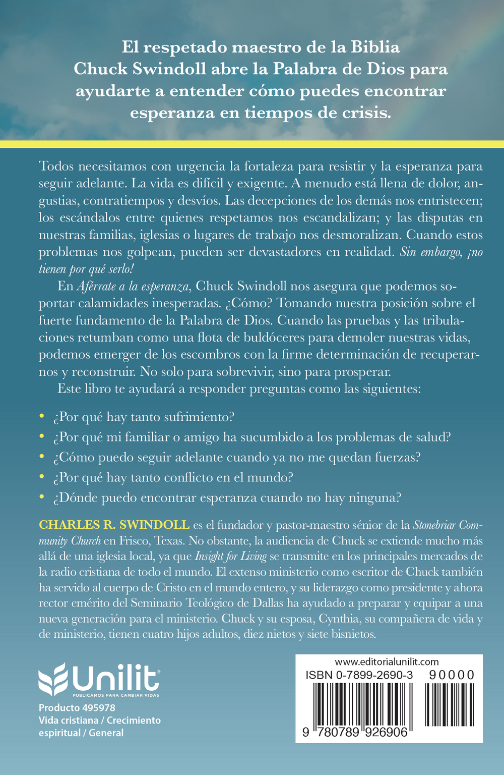 En Aférrate a la esperanza, Chuck Swindoll nos asegura que podemos soportar calamidades inesperadas. ¿Cómo? Tomando nuestra posición sobre el fuerte fundamento de la Palabra de Dios. Cuando las pruebas y las tribulaciones retumban como una flota de buldóceres para demoler nuestras vidas, podemos emerger de los escombros con la firme determinación de recuperarnos y reconstruir. No solo para sobrevivir, sino para prosperar.