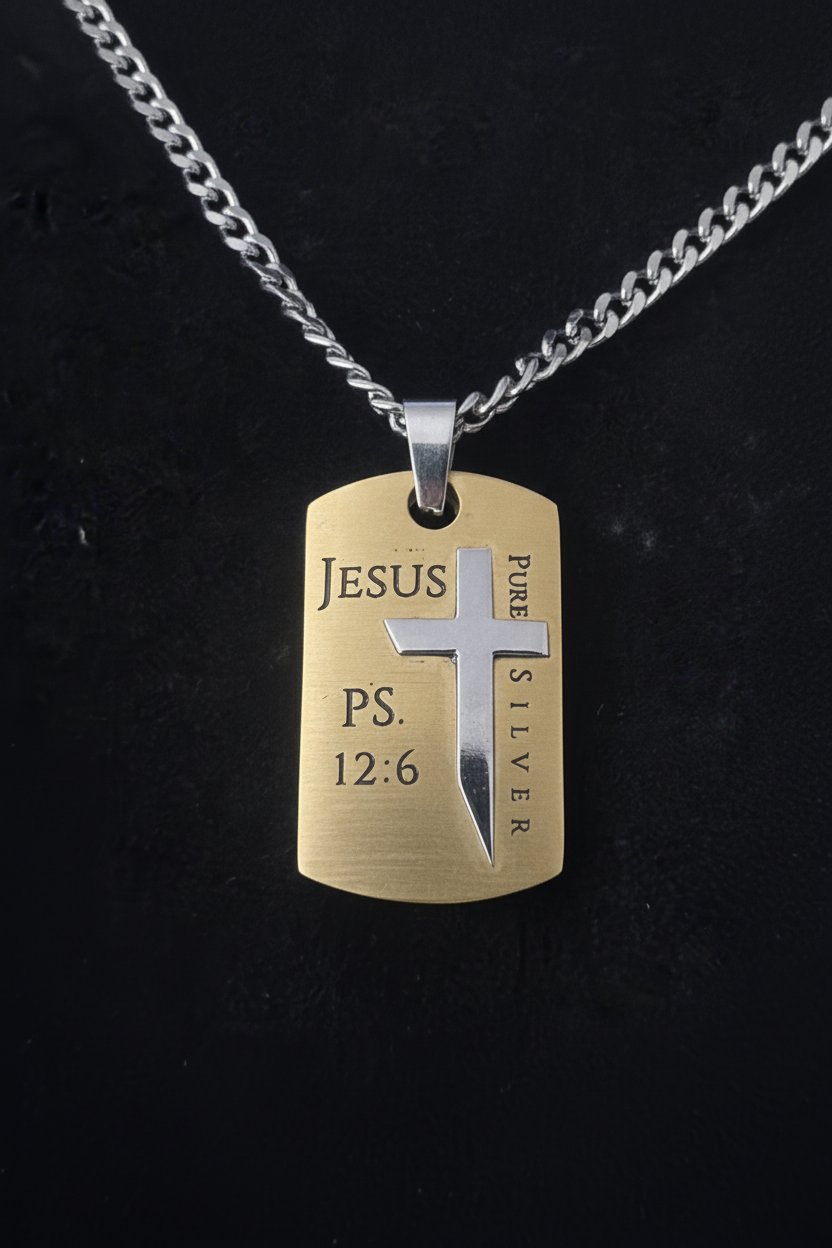 - Front: Silver cross with "Pure Silver" inscription and "Jesus PS 12:6" engraving