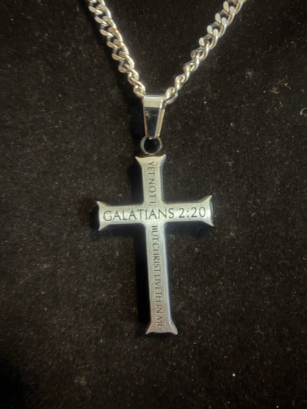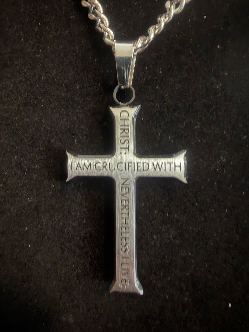 Este elegante collar presenta una cruz de plata con las poderosas palabras de Gálatas 2:20: "Con Cristo estoy juntamente crucificado" ("I am crucified with Christ liveth in me"). Un recordatorio diario de tu identidad en Cristo y el poder transformador del evangelio.