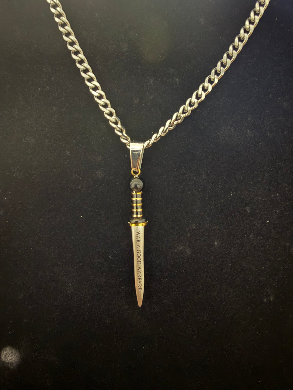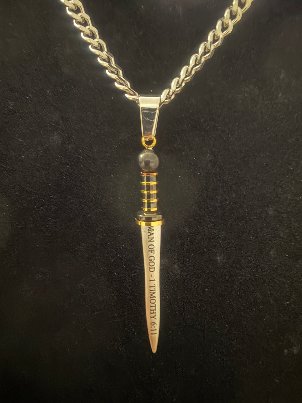 Powerful sword pendant necklace featuring the inspiring scripture from 1 Timothy 6:11 engraved on the blade. This unique piece symbolizes the spiritual armor and strength of a man of God, reminding you to pursue righteousness, faith, and godliness.